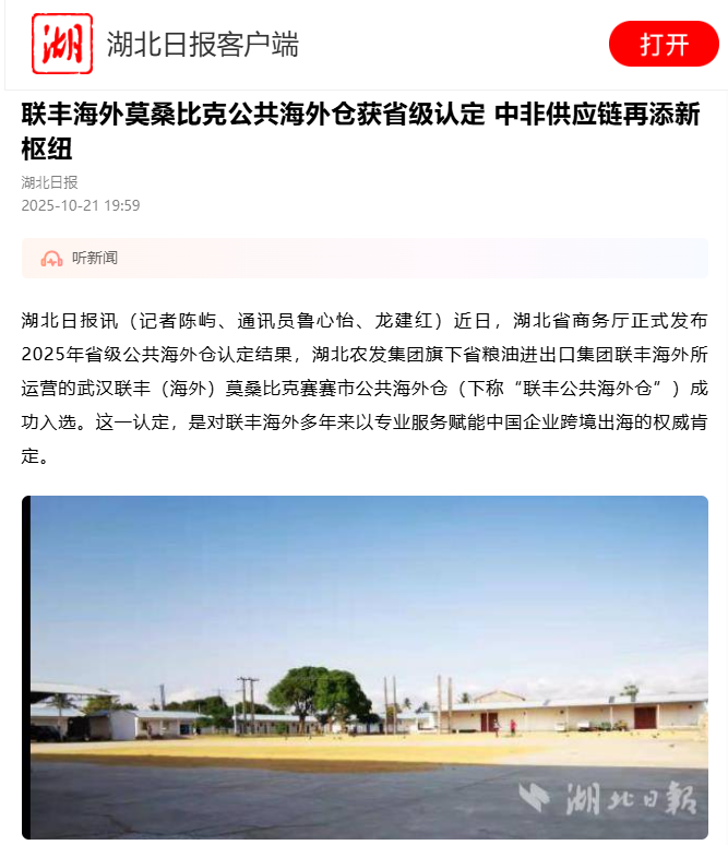 湖北日?qǐng)?bào):聯(lián)豐海外莫桑比克公共海外倉(cāng)獲省級(jí)認(rèn)定 中非供應(yīng)鏈再添新樞紐