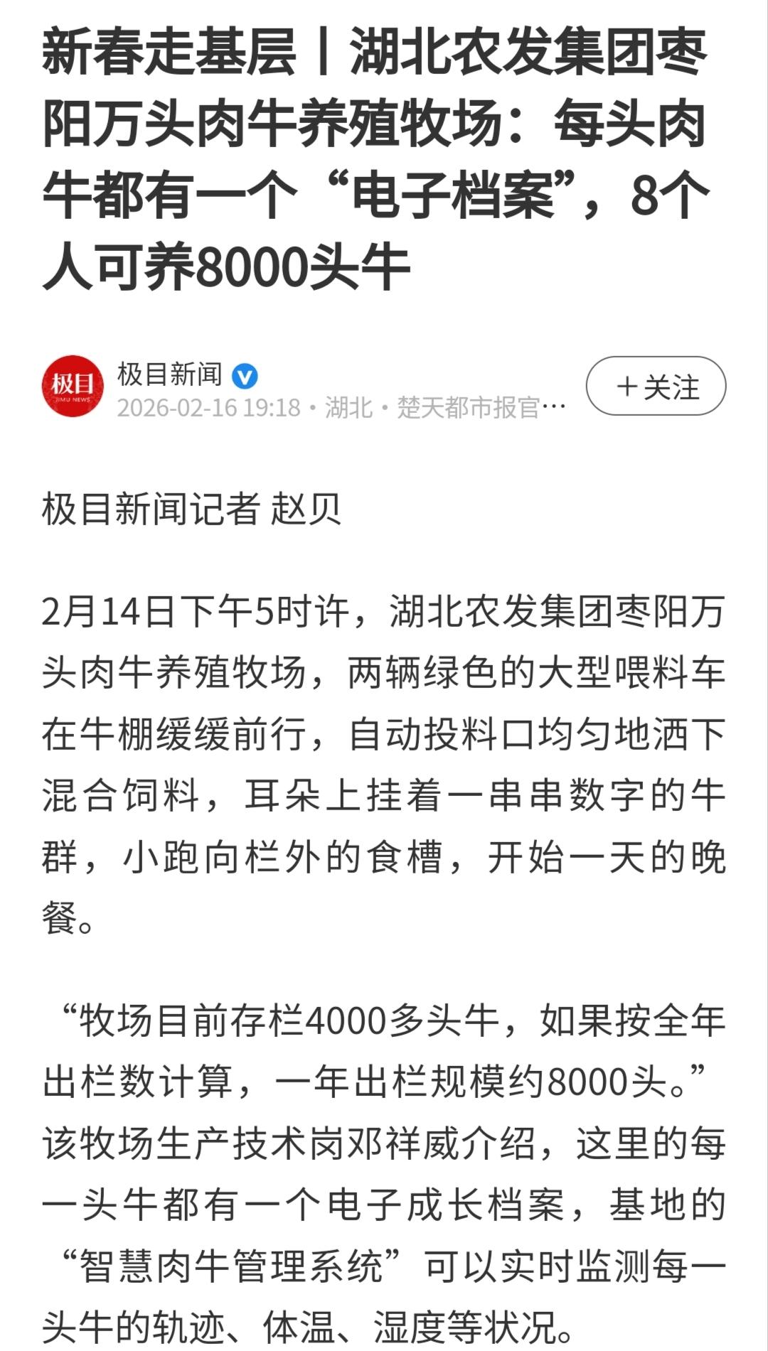 極目新聞:新春走基層 湖北農(nóng)發(fā)集團棗陽萬頭肉牛養(yǎng)殖牧場 每頭肉牛都有一個“電子檔案”,8個人可養(yǎng)8000頭牛