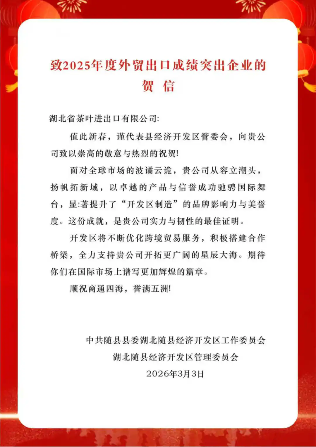 近日,湖北農(nóng)發(fā)集團(tuán)旗下省糧油進(jìn)出口集團(tuán)茶葉進(jìn)出口公司收到中共隨縣縣委湖北隨縣經(jīng)濟(jì)開發(fā)區(qū)工作委員會(huì)、湖北隨縣經(jīng)濟(jì)開發(fā)區(qū)管理委員會(huì)發(fā)來的《致2025年度外貿(mào)出口成績突出企業(yè)的賀信》,這份榮譽(yù)是地方政府對茶葉進(jìn)出口公司成立首年外貿(mào)工作的高度認(rèn)可,更是對企業(yè)深耕茶葉進(jìn)出口主業(yè)、助力鄂茶走向世界的有力激勵(lì)。